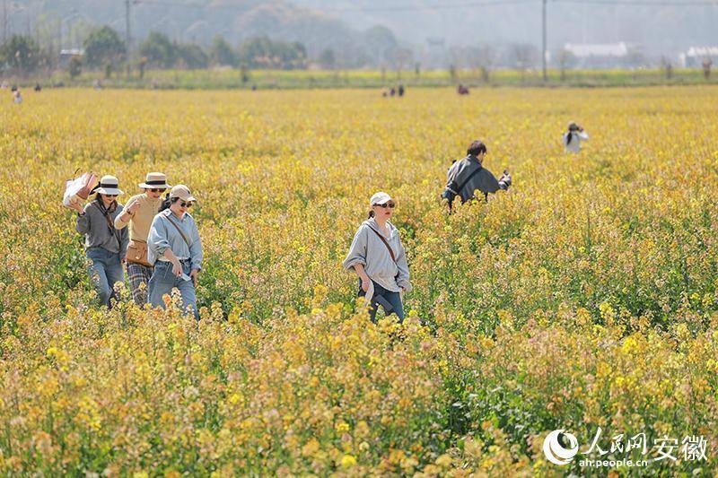 芜湖响水涧,游客在彩色油菜花田里打卡赏花。人民网记者 陶涛摄