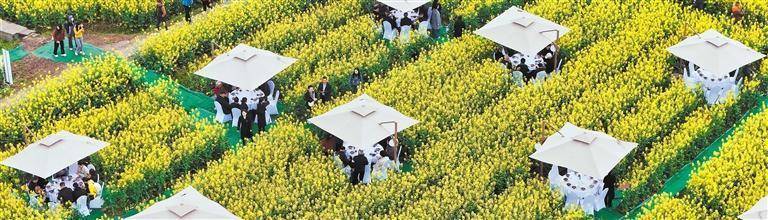 3月13日,游客在四川省南充市蓬安县睦坝镇武胜村油菜花田品尝“花田席”。刘永红摄(中经视觉)
