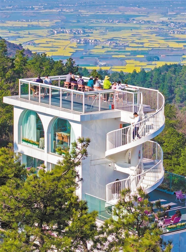 3月13日,安徽省芜湖市峨桥镇,游客在一家山顶咖啡馆欣赏油菜花田美景。当地通过“生态+消费+体验”模式,将自然风光转化为文旅消费动能。肖本祥摄(中经视觉)